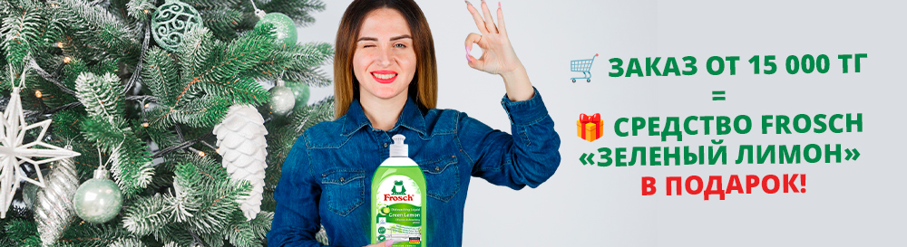 Условия акции просты: при оформлении заказа на сумму от 15 000 тенге вы бесплатно получаете Средство для мытья посуды «Зеленый лимон» объемом 500 мл от известного бренда Frosch.