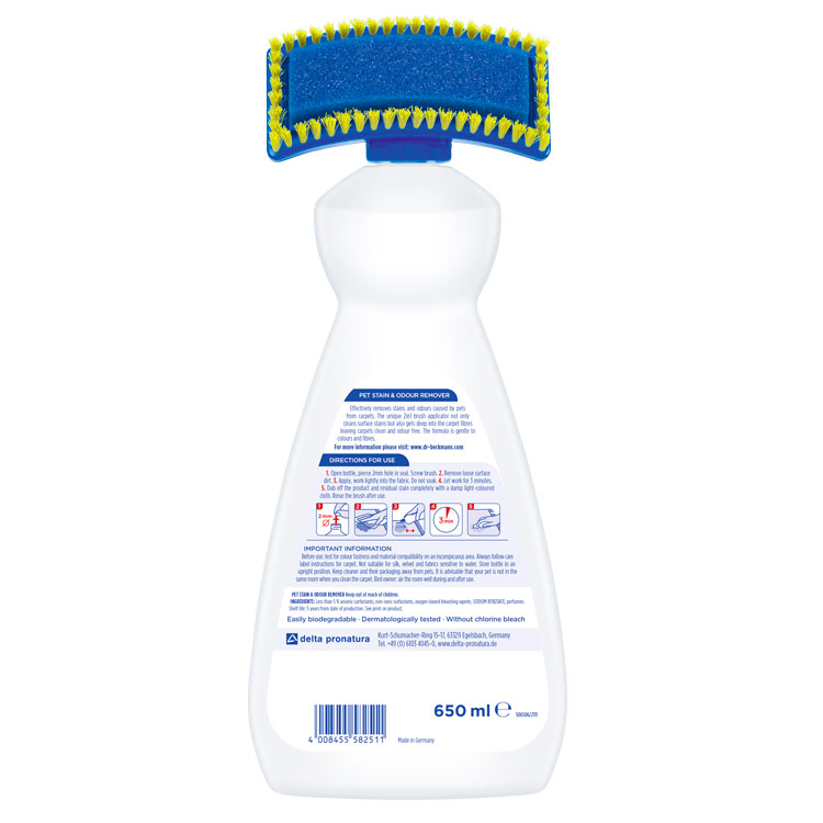 Дақ кетіргіш бояғыштар мен талшықтарға бапты, сонымен қатар жүннен жасалған бұйымдарға жарамды. Дақ кетіргіш үй жануарларынан болатын иістерді бейтараптандырады. Мына нәрселерге қолдануға болмайды: барқыт, жібек, суға төзімсіз маталар. Бірінші қолдану алдында қылшақты бөтелкеден бұрап шешіп алыңыз да, бөтелкенің мойнындағы қорғаныш қабатта тесік (шамамен 2 мм) жасаңыз. Қылшақты тым қатты тартпай бұрап қондырыңыз. Беттегі кір қалдықтарын кетіріңіз. Бөтелкені қылшағымен төмен қарата ұстап тұрып, аппликатор губкасын сулау үшін сәл басыңыз. Дақ кетіргішті даққа жағып (кілемді негізіне дейін суламаңыз), дақты қылшақпен сәл ғана ысқылап, оны 3 минутқа қалдырыңыз. Кір мен дақтарды таза және дымқыл шүберекпен тазалаңыз. Қажет болса, қолдануды қайталаңыз. Әр қолданғаннан кейін аппликатор-қылшақты шайыңыз. Құрамы: натрий этасульфаты, сутегі асқын тотығының ерітіндісі. Жарамдылық мерзімі: орамнан қар.. Германияда өндірілген, «Дельта-Пронатура» 63329 Эгельсбах.