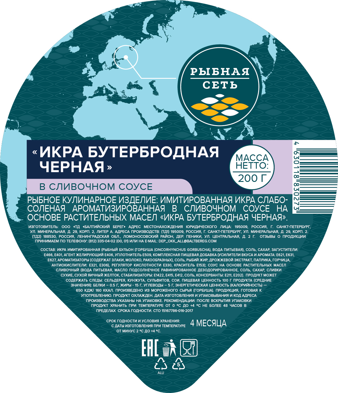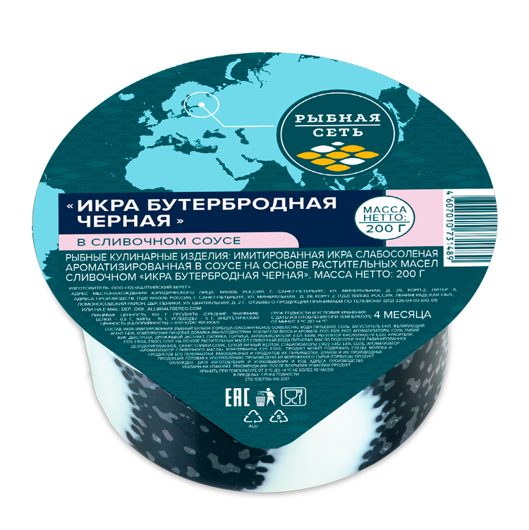 Икра бутербродная черная имитированная в сливочном соусе 200гр ПЭТ банка Рыбная сеть