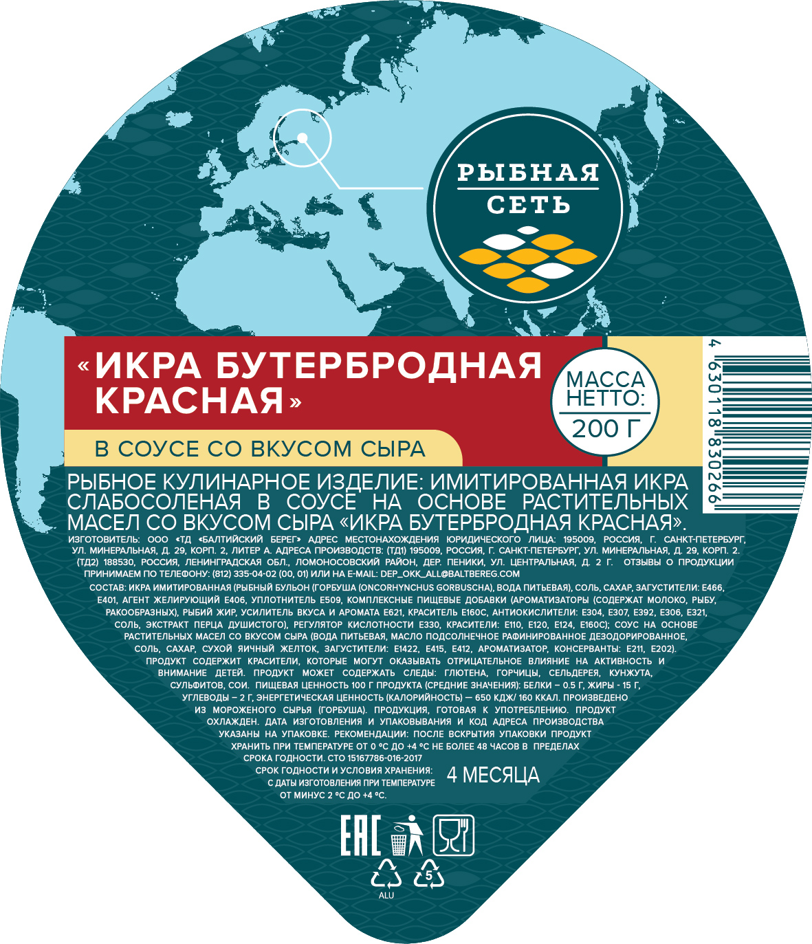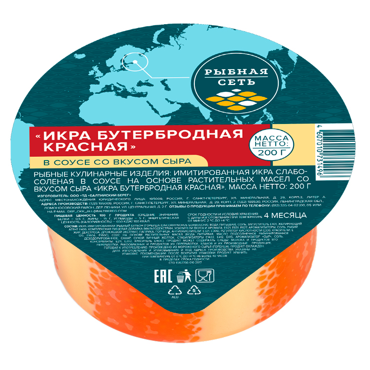 Икра бутербродная красная имитированная в сырном соусе 200гр ПЭТ банка Рыбная сеть