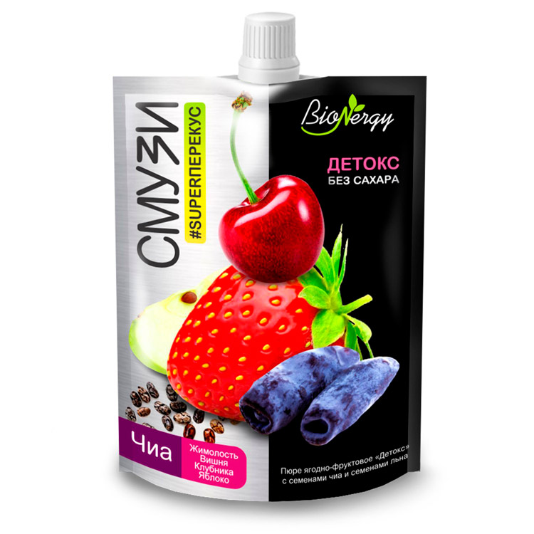Смузи Детокс BioNergy жимолость, вишня, клубника, яблоко, семена чиа 120г дой-пак САВА