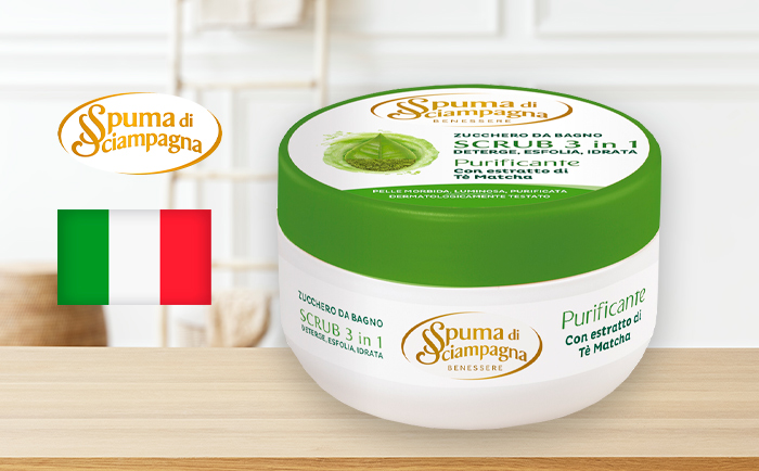 Скраб для тела сахарный очищающий Матча Spuma di Sciampagna обогащен натуральным маслом макадамии и экстрактами матча для бархатистого и очищающего эффекта. Формула 3-в-1 очищает, отшелушивает и увлажняет одновременно, устраняя мертвые клетки кожи и делая кожу мягкой и сияющей.