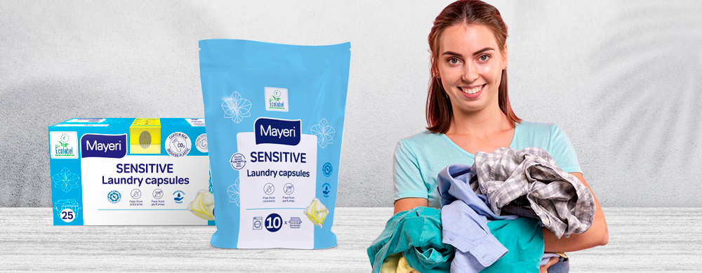 Главная особенность новинки — полностью гипоаллергенная формула. Sensitive Mayeri разработаны специально для людей с чувствительной кожей, склонностью к аллергическим реакциям, а также для ухода за детским бельем. Капсулы не содержат хлора, оптических отбеливателей, красителей и агрессивных отдушек, что минимизирует риск раздражения и обеспечивает бережную стирку.