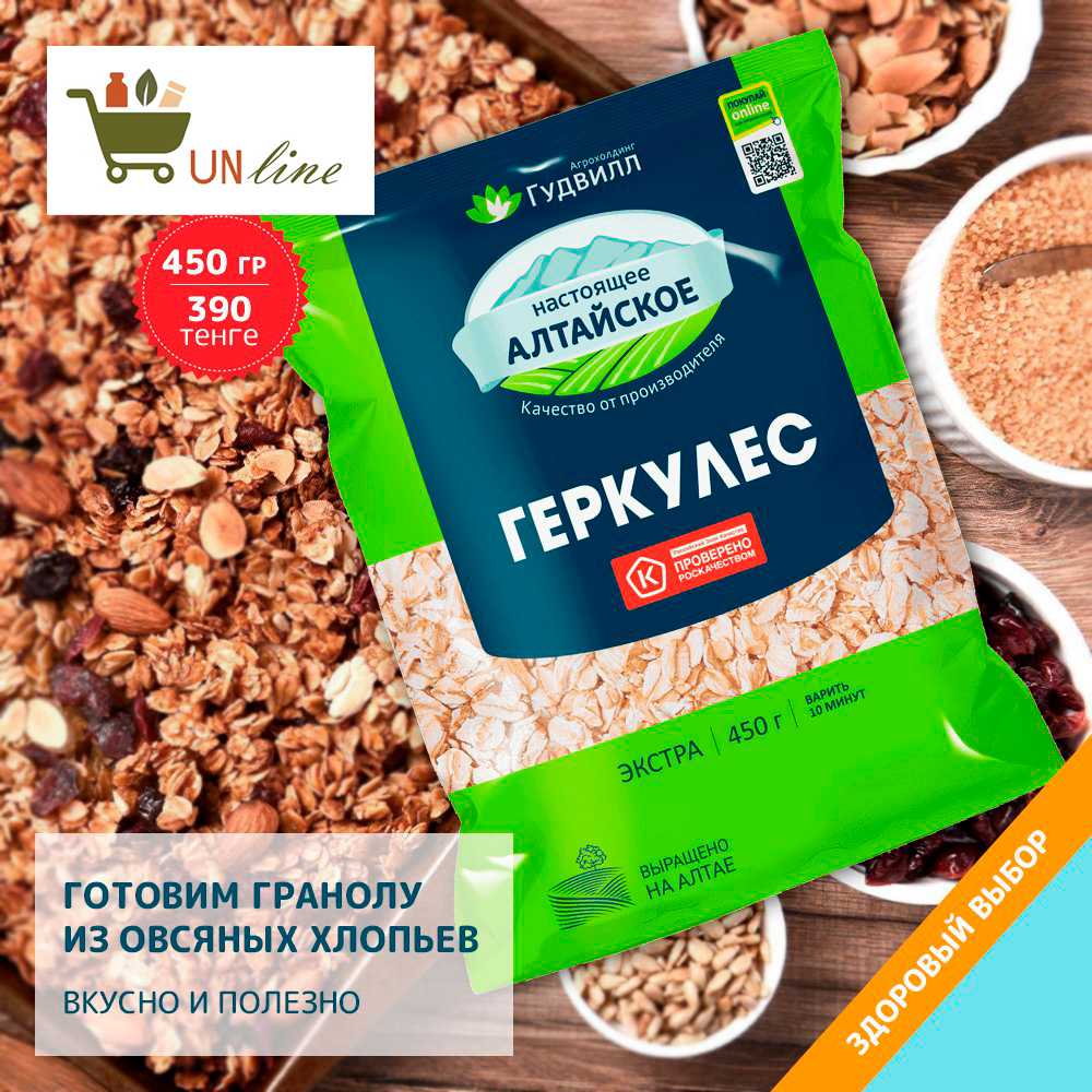 Гранола — это вкусный и полезный снек, который легко приготовить дома. Тебе понадобятся овсяные хлопья (Геркулес хлопья 450гр мягк упак Гудвилл), орехи, семена, сухофрукты, мед или сироп, масло и пряности.